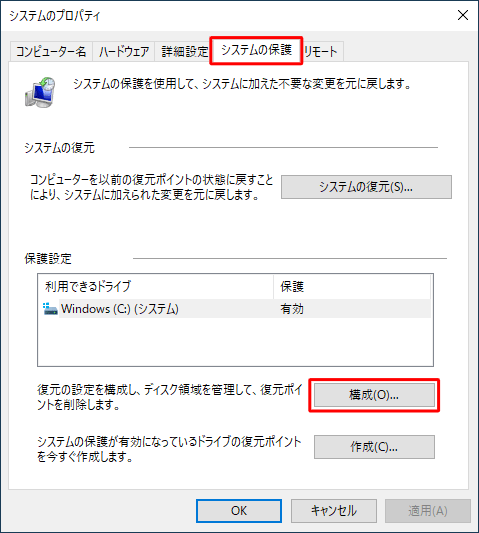 「設定の復元」欄から「システムの保護を有効にする」をクリックし、「OK」をクリックします。