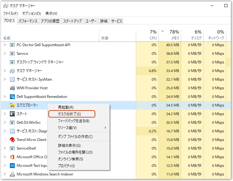 この中で終了したいプログラムを選んで(右クリックして)「タスクの終了」をクリックすれば終了させることができます。